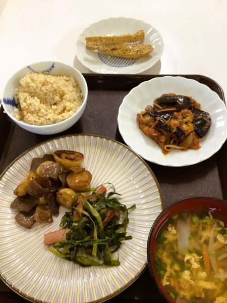 かわいい新じゃがとこんにゃくの照り焼き、炒め物やスープも並びました。