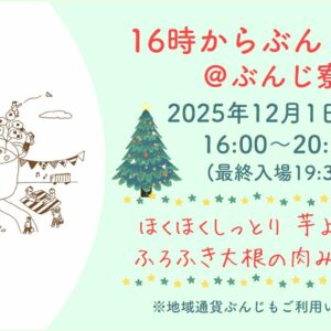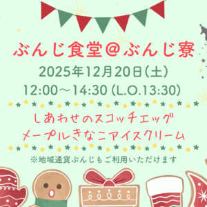 12月20日(土)は、お昼の時間に「ぶんじ食堂」をぶんじ寮で開催します。12:00からお入りください。おやつのみや、テイクアウトのご利用も大...続きを読む